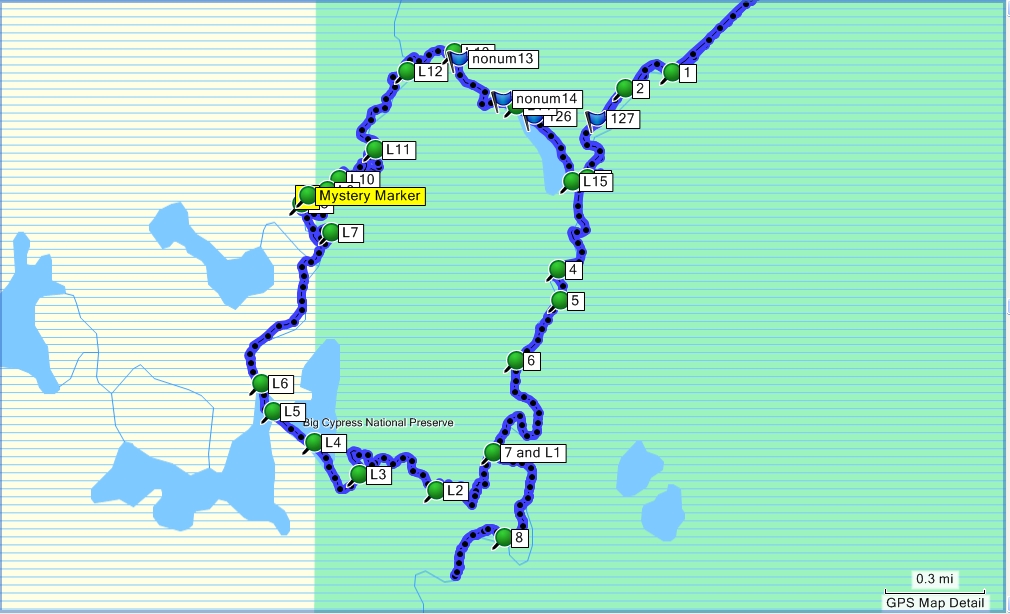 This was interesting in that I had never done it before and that it was mostly small and narrow. We did not see very much wildlife and I could not really see much evidence that that there was any. No tracks on the banks. No alligators live here and we did not see snakes. There were some very energetic fish from time to time that would jump two vertical and three horizontal feet, impressive.